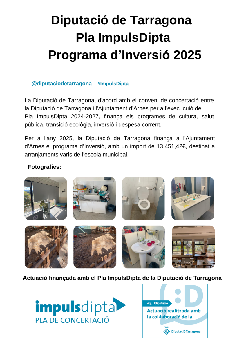 - La Diputació de Tarragona, ha subvencionat "Obres de caràcter urgent a diferents carrers d'Arnes per a la prestació serveis minims", per un import de 27.537,99€.
