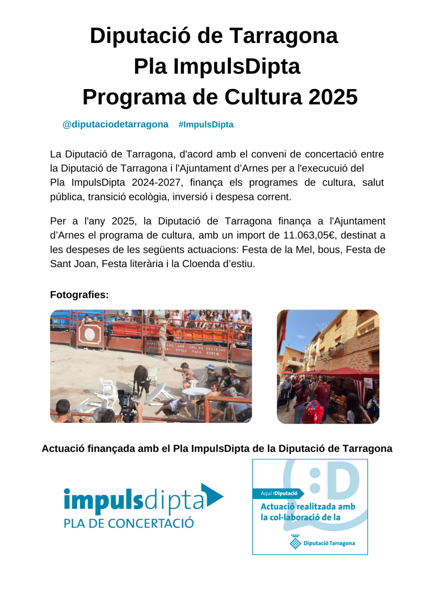 - Els Programes i Activitats Culturals: Programa i Activitats Culturals Arnes per un import de 1.346,32€.